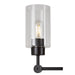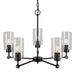 The Jayden chandelier offers a clean transitional design with clear cylindrical glass shades atop a cast round medallion connector. This fixture comes in black or antique bronze finished steel. Arms can be rotated to an up or downward position. Add an Edison style bulb for a more transitional look or an `A` type LED for a more contemporary feel. This 5-light chandelier measures 24 in. L x 24 in. W x 19 in. H.