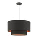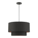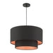 The Sentosa collection has a modern and retro appeal. The hand-crafted black fabric hardback shade is set off by the silky orange fabric on the inside creating an intriguing effect. The three-light double drum shade adds character to this handsomely styled pendant. Perfect fit for the living room, dining room, kitchen and bedroom. This sleek design is shown in a black finish.