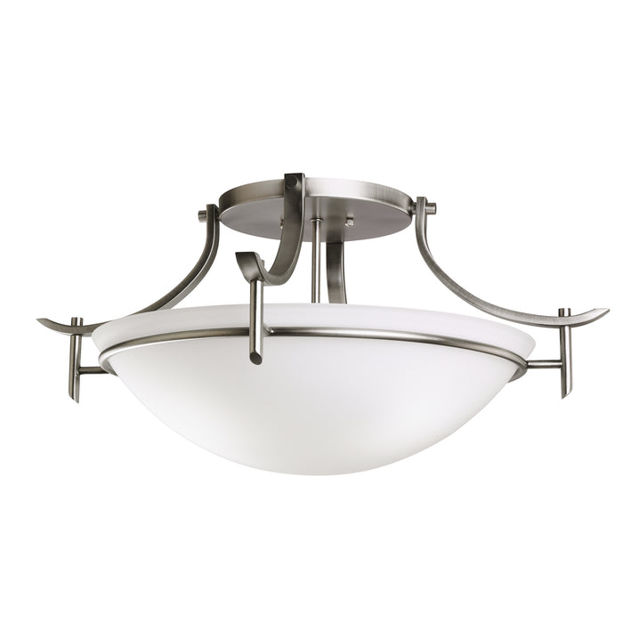 The Olympia(TM) Collection brings a modern twist on the classic aesthetic to create a new form the likes of which has not been seen before. The curvilinear, flowing arms create a clean, contemporary profile for your home. The Antique Pewter finish combined with Satin-etched white glass presents a natural color palate capable of matching any d?cor. For a simple approach, the Olympia(TM) Collection offers its unique look as an inspirational semi-flush ceiling fixture. It is a 3-light design that requires a 100-W Max bulbs to light the Satin-etched cased opal glass, creating glowing light with chic sophistication. Diameter 21in., height 11 1/2in..