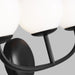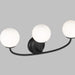The Galassia three light wall sconce by AERIN in midnight black perfectly balances a glass globe and curving teardrop frame, giving it a contemporary look. The white glass casts a soft, welcoming glow over a space. This piece works particularly well in a hallway.
