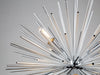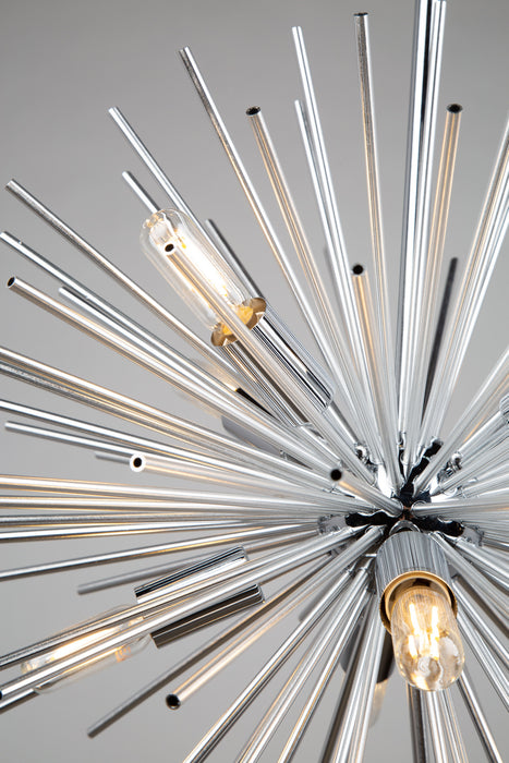 The Sunburst Collection 8 light chandelier is unique and a definitely beautiful focal point. Features aluminum color thin hollow rods attached to a chrome center. (also available with satin brass interior cluster).