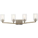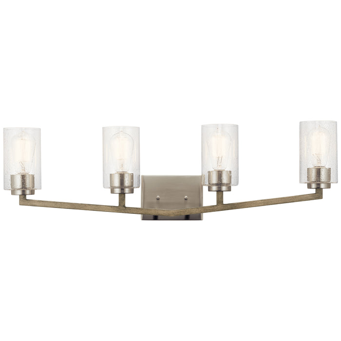 The 4-light wall mount from the Deryn(TM) bath collection delivers a minimalist style with crisp, clean lines and angled structure. Accented with Clear Seeded Glass and a Distressed Antique Grey finish, the fixture makes an excellent addition to refined rustic and coastal bath settings.