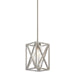 Inspired by vintage industrial shipping crates, the 1-light mini pendant in Distressed Antique White from the Moorgate(TM) collection features an oversized X pattern in a sleek Distressed Antique White and Brushed Nickel finish combination. Knurled sockets in a contrasting finish bring a premium detail to this substantial, yet simple, statement piece.