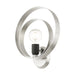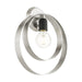 The Modesto collection hints at a casual mid-century modern vibe. It features steel straps that form beautiful circular shapes. The exposed bulbs and two-toned combination of finishes create a fashionable statement for today`s interiors. This single-light wall sconce is shown in a brushed nickel finish with a black accent. It will look fantastic in your mid-century modern loft living room, hallway, bathroom or any contemporary style interior.