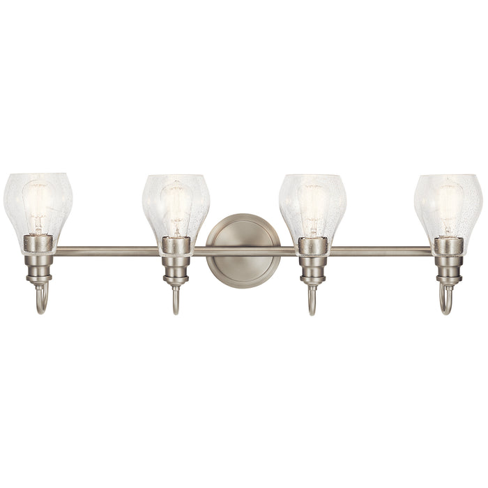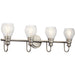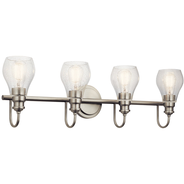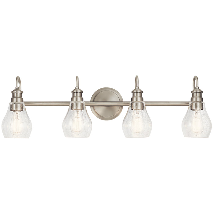 An updated twist on a popular vanity lighting style, this Greenbrier(TM) collection 4 light bath light`s teardrop-shaped shades feature clear seeded glass for added visual interest. Tailored and subtly detailed arms in a brilliant Nickel finish bring a sophisticated feel.