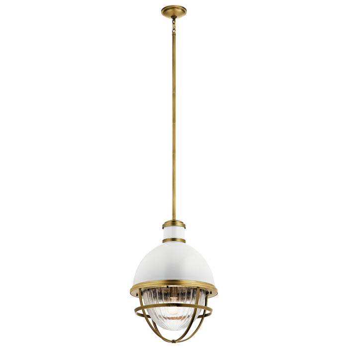 Fresh and stylish, the Tollis(TM) 1-light foyer pendant is designed with a high gloss white dome, Clear Ribbed glass, and a Natural Brass finish to help set the tone for a relaxing atmosphere.
