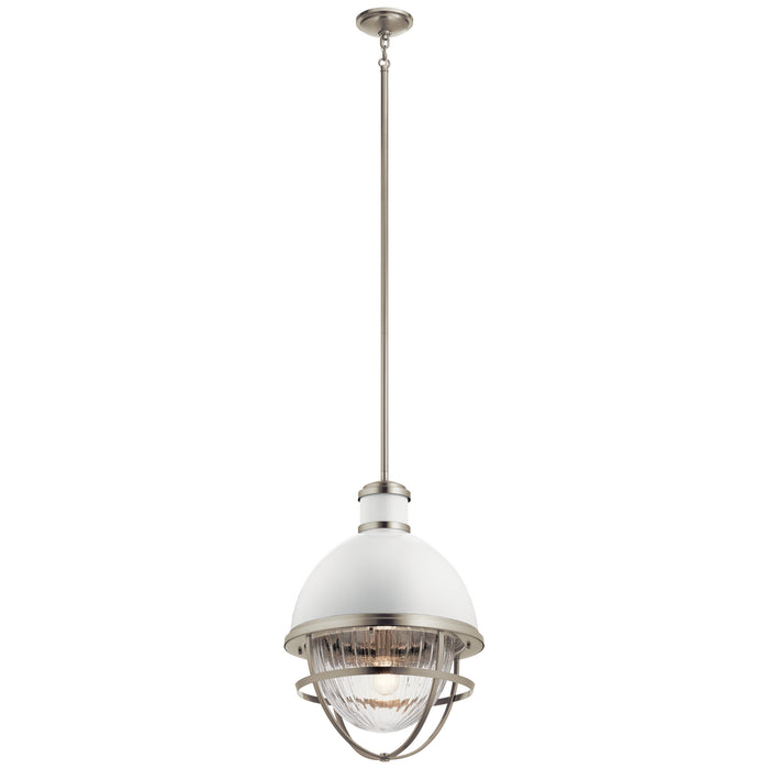 Fresh and stylish, the Tollis(TM) 1-light foyer pendant is designed with a high gloss white dome, Clear Ribbed glass, and a Brushed Nickel finish to help set the tone for a relaxing atmosphere.