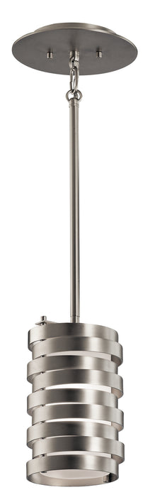This 1 light mini pendant from the Roswell(TM) collection will create a unique impression in your home. The Brushed Nickel outer finish and beautiful Satin Etched Glass form a distinctive, linear design.