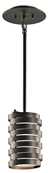 This 1 light halogen mini pendant from the Roswell(TM) collection will create a unique impression in your home. The Olde Bronze(R) outer finish with Gold Tone inner highlights and beautiful Satin Etched Glass form a distinctive, linear design.