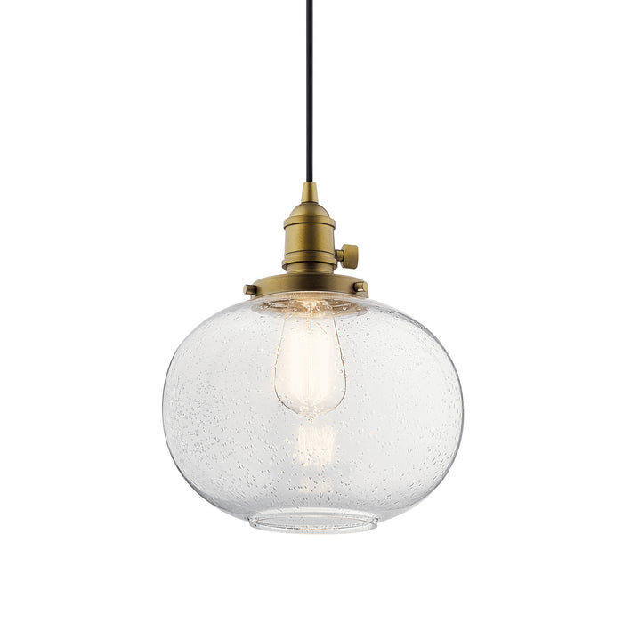 Create a mix and match masterpiece with this 1 light pendant from the Avery collection. Available in a Natural Brass finish with adjustable cording, Clear Seeded glass, and working paddle switches, this pendant stands out beautifully on its own or in a cluster.