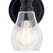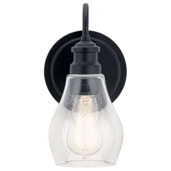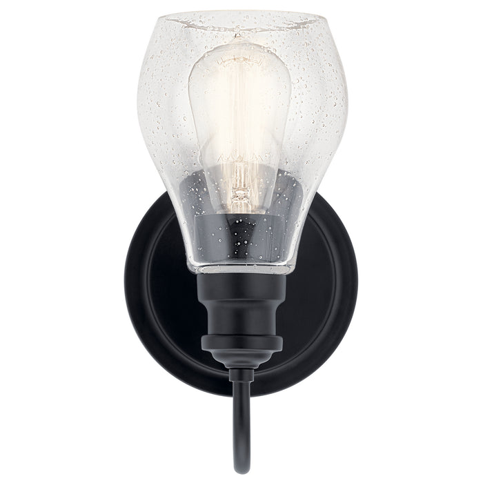An updated twist on a popular vanity lighting style, this Greenbrier(TM) collection 1 light wall sconce`s teardrop-shaped shade features a clear seeded glass for added visual interest. Tailored and a subtly detailed arm in a brilliant Black finish bring a sophisticated feel.