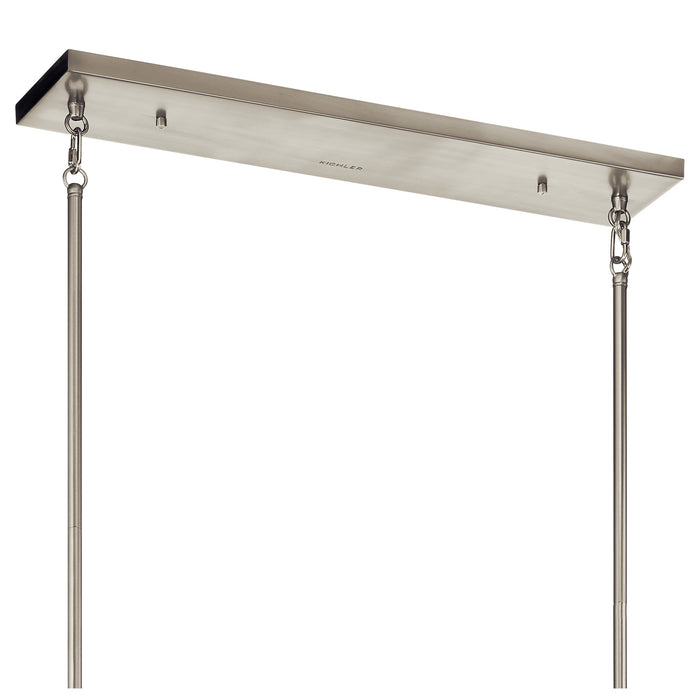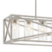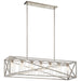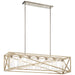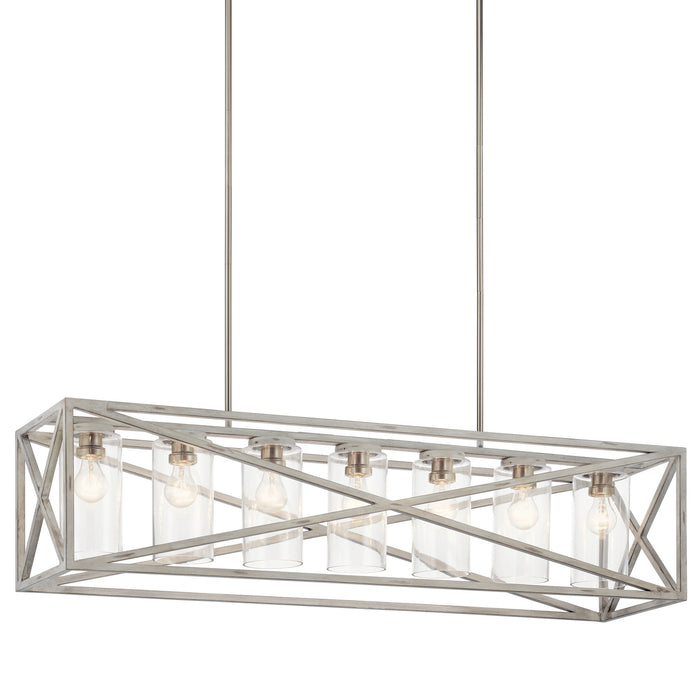 Inspired by vintage industrial shipping crates, the 7-light linear chandelier in Distressed Antique White from the Moorgate(TM) collection features an oversized X pattern in a sleek Distressed Antique White and Brushed Nickel finish combination. Knurled sockets in a contrasting finish bring a premium detail to this substantial, yet simple, statement piece.