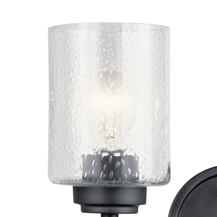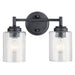 The modern Winslow 2-light 12.75in. bath light in a Black finish with Clear Seeded glass shade pair beautifully with the linear arms, bringing light and dimension to a space.