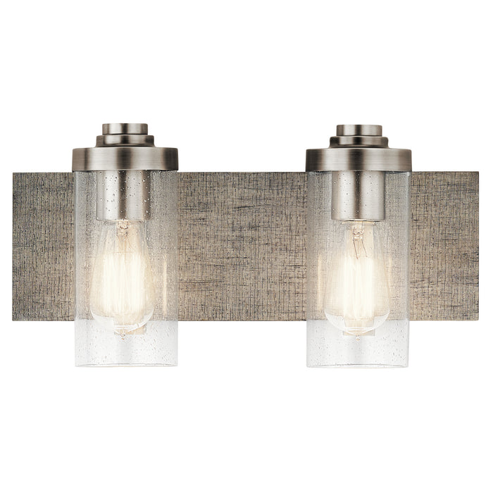 The look of rustic reclaimed wood planking serves as a backdrop for the unexpected style of the Dalwood(TM) 2-light 16.25in. bath light. The Classic Pewter finish and Seeded glass adds to the vintage feel.