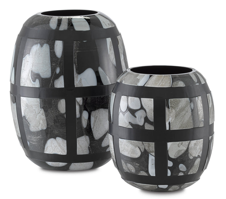 The Schiappa Glass Vases, which come in a set of two, are made of mouth-blown glass with a black surface onto which a mottled layer of multicolor glass has been added as it was being blown. To create an additional layer of artistry, a thick adhesive tape has been applied in a crisscross pattern that is sand blasted to remove the multicolor layer and reveal a black grid-like overlay.